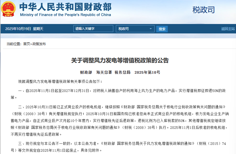 【環球網財經綜合報道】近日,財政部、海關總署、税務總局聯合發佈《關於調整風力發電等增值税政策的公告》(簡稱《公告》),宣佈將取消或調整多個行業的增值税優惠政策。此舉被視為新一輪財税改革中規範税收優惠政策、促進市場公平競爭的重要舉措,將於2025年11月1日起正式施行。