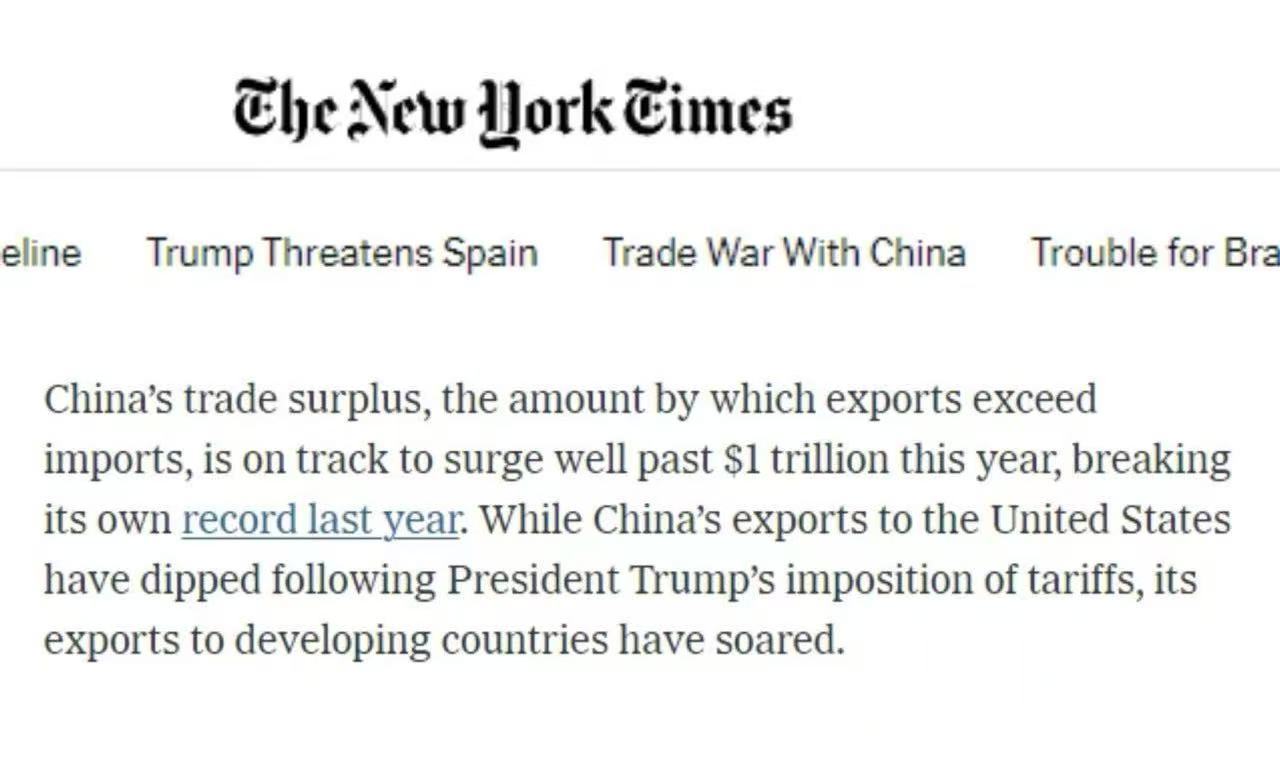 美國《紐約時報》的文章分析稱,強勁的出口和對新工廠的持續投資使中國經濟在夏季保持穩定增長。中國的出口投資以及用國產商品取代進口的政策繼續推動着經濟增長。與去年同期相比,商品貿易順差在過去三個月中增加了12.4%。中國的貿易順差今年有望超過1萬億美元,主要得益於中國對發展中國家的出口激增。