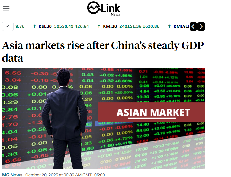 巴基斯坦金融網站Mettis Global Link發表題為《亞洲股市響應中國穩健GDP數據普漲》的文章。文章分析稱,亞洲市場20日迎來開門紅,得益於中國的最新經濟數據。中國第三季度GDP同比增長4.8%,同時維持貸款市場報價利率(LPR)。股市方面,香港恒生指數大漲逾2%,內地滬深300指數上漲0.74%。日經225指數飆升近3%,首次突破49000點大關,東證指數上漲2%。
