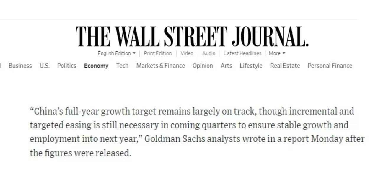 美國《華爾街日報》報道顯示,2023年前三季度中國GDP同比增長5.2%,意味着"5%左右"的年度增長目標已基本達成。報道援引高盛分析師觀點稱,雖然未來幾個季度仍需實施漸進式、結構性的寬鬆政策,但全年經濟增速仍將總體符合預期。
