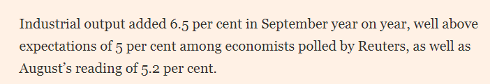 英國《金融時報》的文章分析説,9月規模以上工業增加值同比增長6.5%,顯著高於路透社調查經濟學家預期的5%及8月的5.2%。荷蘭國際集團(ING)經濟學家分析稱,超預期表現主要源於外需拉動。文章説,上週,海關數據顯示,中國出口保持韌性,9月同比增長8.3%,對東南亞等地區出口持續增長。