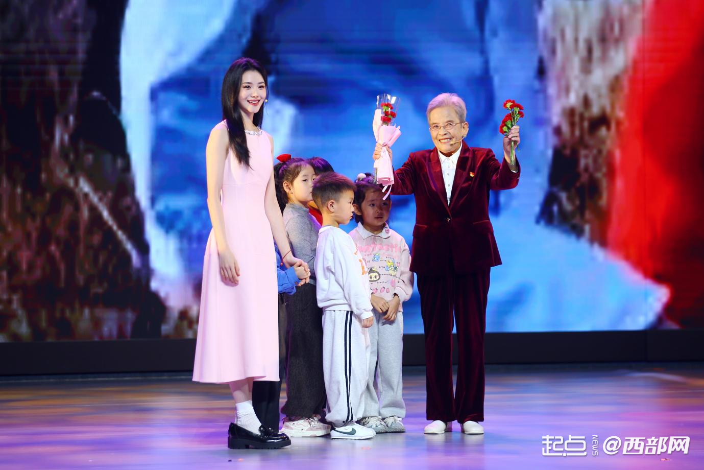 啓動儀式現場,演員劉浩存牽着小朋友們為路生梅送上鮮花。