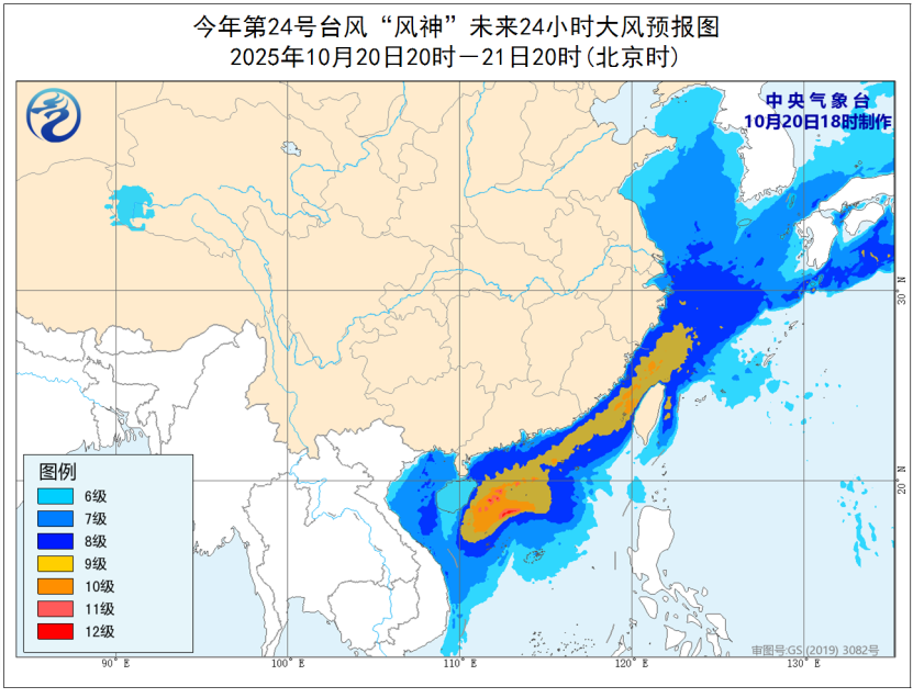 *大風預報:*受冷空氣和“風神”的共同影響,20日20時至21日20時,台灣海峽、台灣以東洋麪、巴士海峽、南海北部和中部、東沙羣島、西沙羣島及中沙羣島附近海域、北部灣、瓊州海峽、東海、黃海、渤海海峽以及山東半島沿海、江蘇沿海、上海沿海、長江口區、杭州灣、浙江沿海、台灣沿海、福建沿海、廣東沿海、廣西沿海、海南島沿海將有6-8級大風,陣風9-10級,其中東海西南部、台灣海峽、台灣以東洋麪、浙江南部沿海、福建沿海、廣東東部沿海、南海北部和中西部的部分海域或地區的風力有9-10級,陣風11-12級,颱風中心經過的附近海域風力可達11-12級,陣風13-14級。