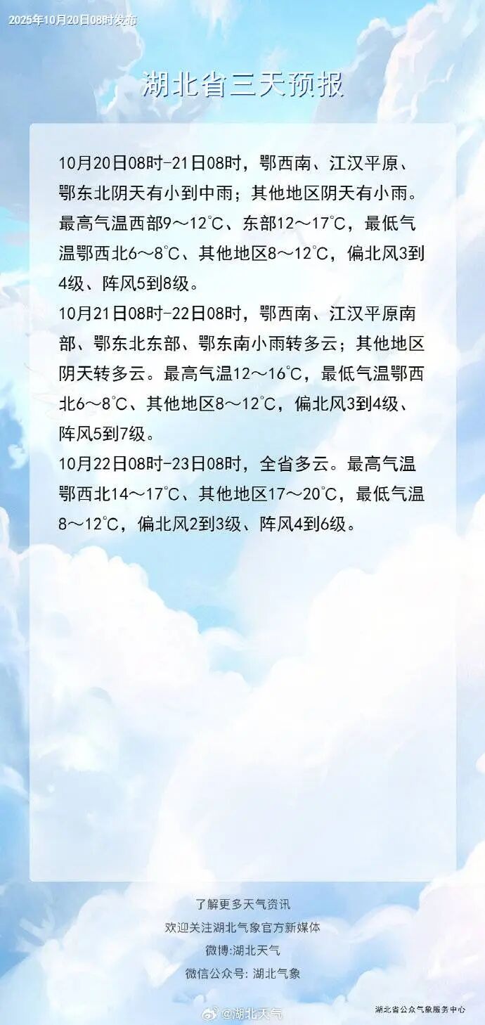 據湖北省氣象局20日消息,預計今天我省陰雨持續並伴有大風降温天氣,大部地區有小雨,鄂西南、江漢平原、鄂東北西部有中雨,西部最高氣温降至9~12℃,東部降至12~17℃。