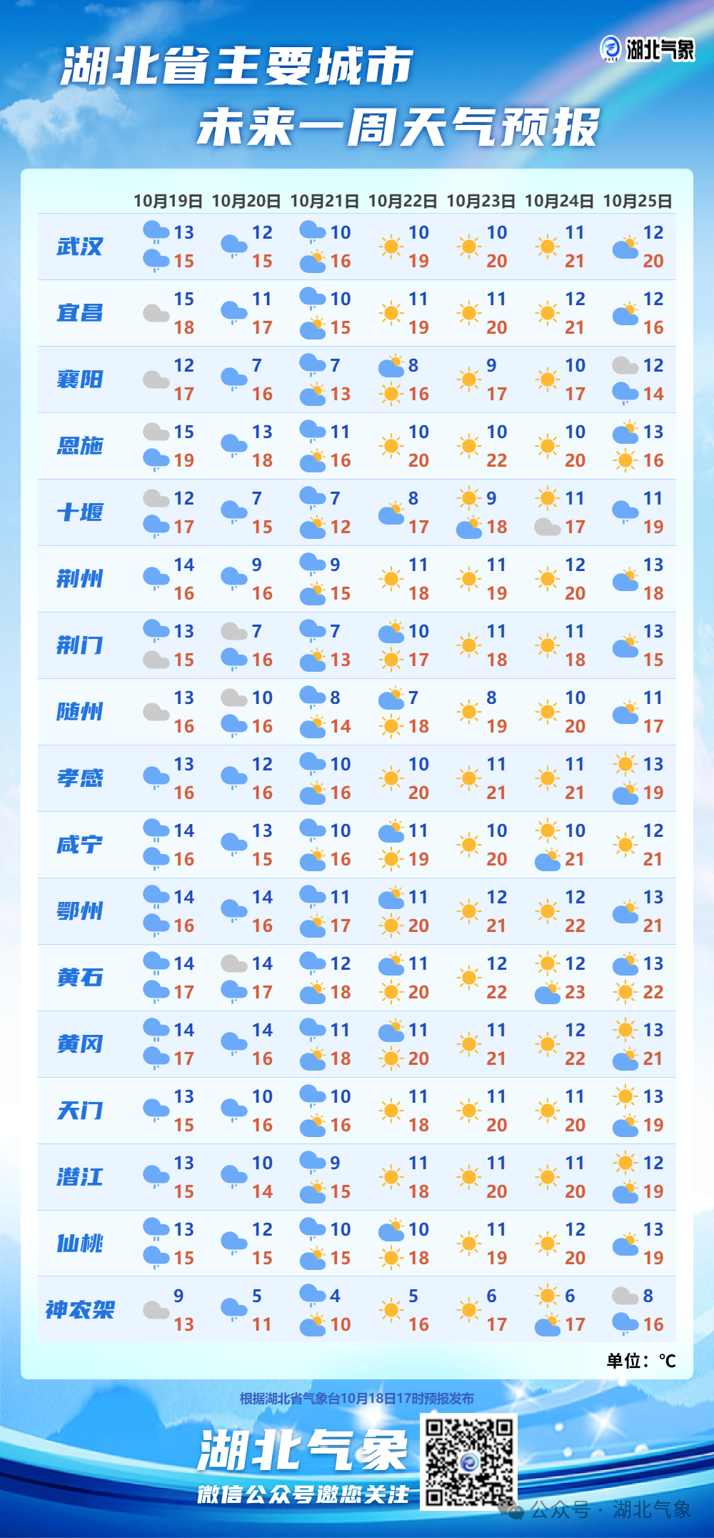 *10月21日08時-22日08時:*湖北省陰天轉多雲。最高氣温12~18℃,最低氣温鄂西北6~8℃、其他地區8~12℃,偏北風3到4級、陣風5到7級。