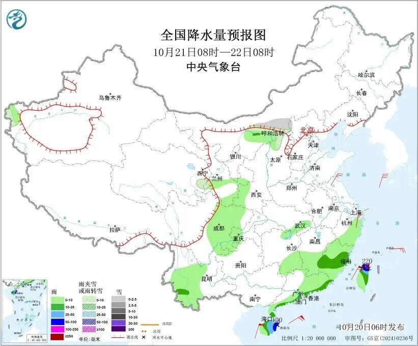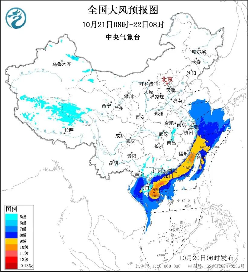 預計10月21日08時至22日08時,新疆北部和東部、甘肅河西、西藏西部和北部、青海南部、江蘇南部、安徽南部、江西北部、廣東南部、廣西南部等地部分地區有5~6級風,陣風7~8級;東海西南部海域、台灣海峽、台灣以東部分海域、南海北部和中西部的偏北海域將有9~10級、陣風11~12級的大風,其中南海西北部的部分海域風力可達11級、陣風12~13級。黃海中部和南部海域、東海北部海域、台灣以東洋麪、北部灣將有7~8級、陣風9級的大風。