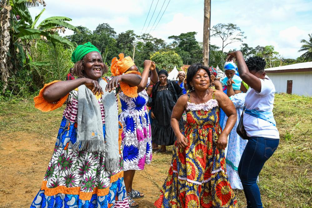 2025年10月8日,在喀麥隆松明比亞斯村,村民慶祝中國企業建設的農村離網太陽能電站項目正式啓用。新華社發(科普索攝)