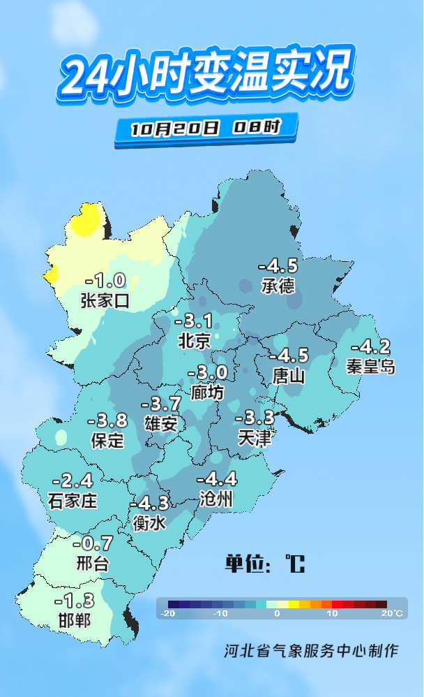和昨天同時刻相比,今日8時河北省大部地區氣温繼續下降,承德、唐山、秦皇島、廊坊、保定、滄州、衡水一帶降温幅度多達4~6℃。