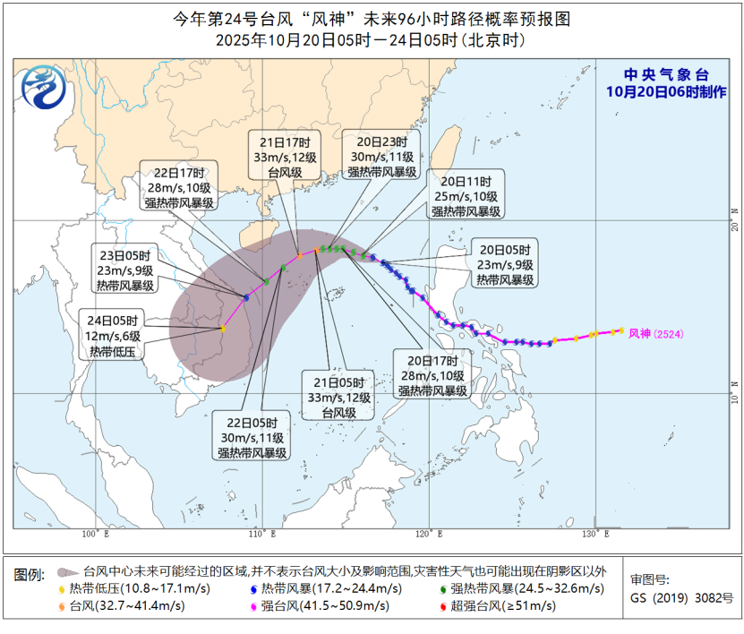 同時,東海南部海域、台灣海峽、南海北部和中部海域及浙江南部沿海、福建沿海、廣東東部沿海將有9~10級、陣風11~12級的大風,其中南海中部的部分海域風力可達11~12級、陣風13~14級。黃海大部海域、東海北部海域、巴士海峽、台灣以東洋麪、北部灣將有7~8級、陣風9級的大風。