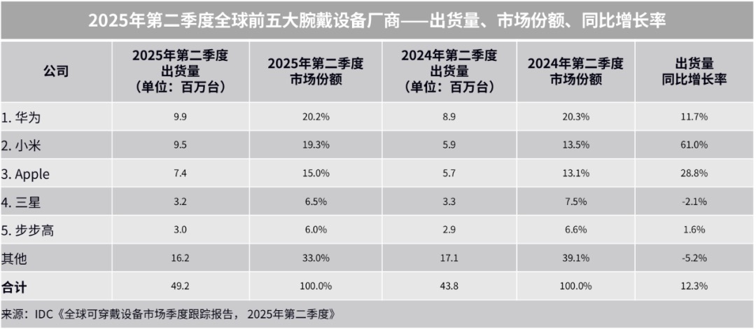 IDC最新發布的2025年第二季度全球腕戴設備市場報告顯示,在整體市場12.3%的同比增長態勢中,華為以990萬台出貨量、20.2%的市場份額蟬聯全球榜首,出貨量同比增幅達11.7%,在頭部廠商中展現出極強的市場韌性,而其在中國市場連續6年出貨量第一的成績,更印證了品牌紮根本土的深厚積澱。