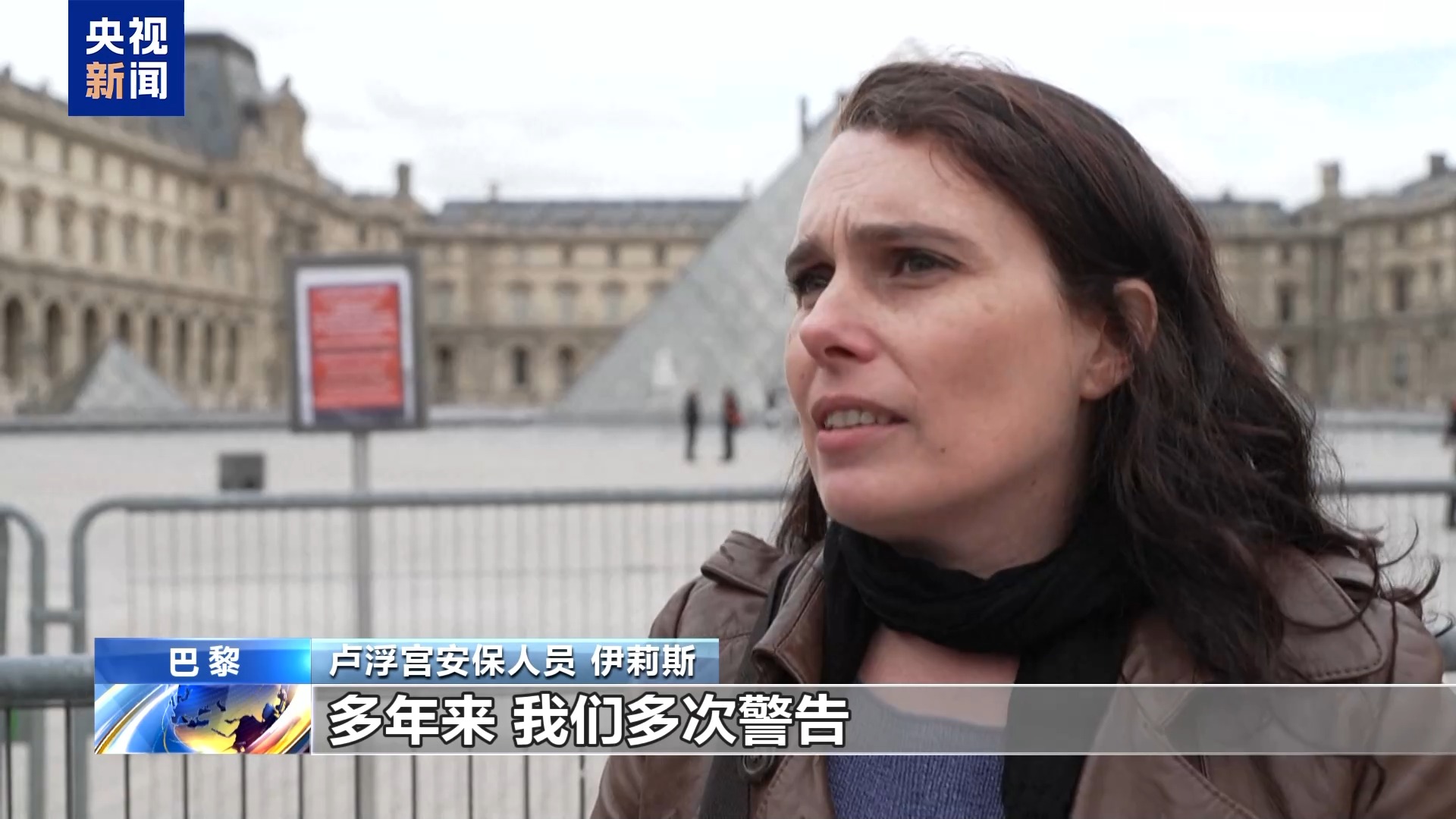 *盧浮宮安保人員 伊莉斯:*過去十年裏盧浮宮失去了190個安全和監控崗位,在法國文化部有一個專門負責安全、 安保和文化遺址保護的部門。在過去十年裏,該部門被削減了25%的崗位。當你取消專業崗位時,你遲早要付出代價,這次發生的搶劫事件,比電影情節更誇張、更嚴重。