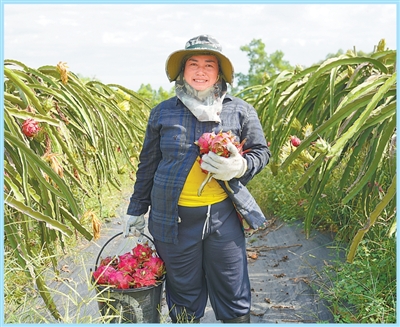 8月,位於老撾萬象的中國—老撾合作農作物優良品種試驗站火龍果示範基地,農户感受豐收的喜悦。