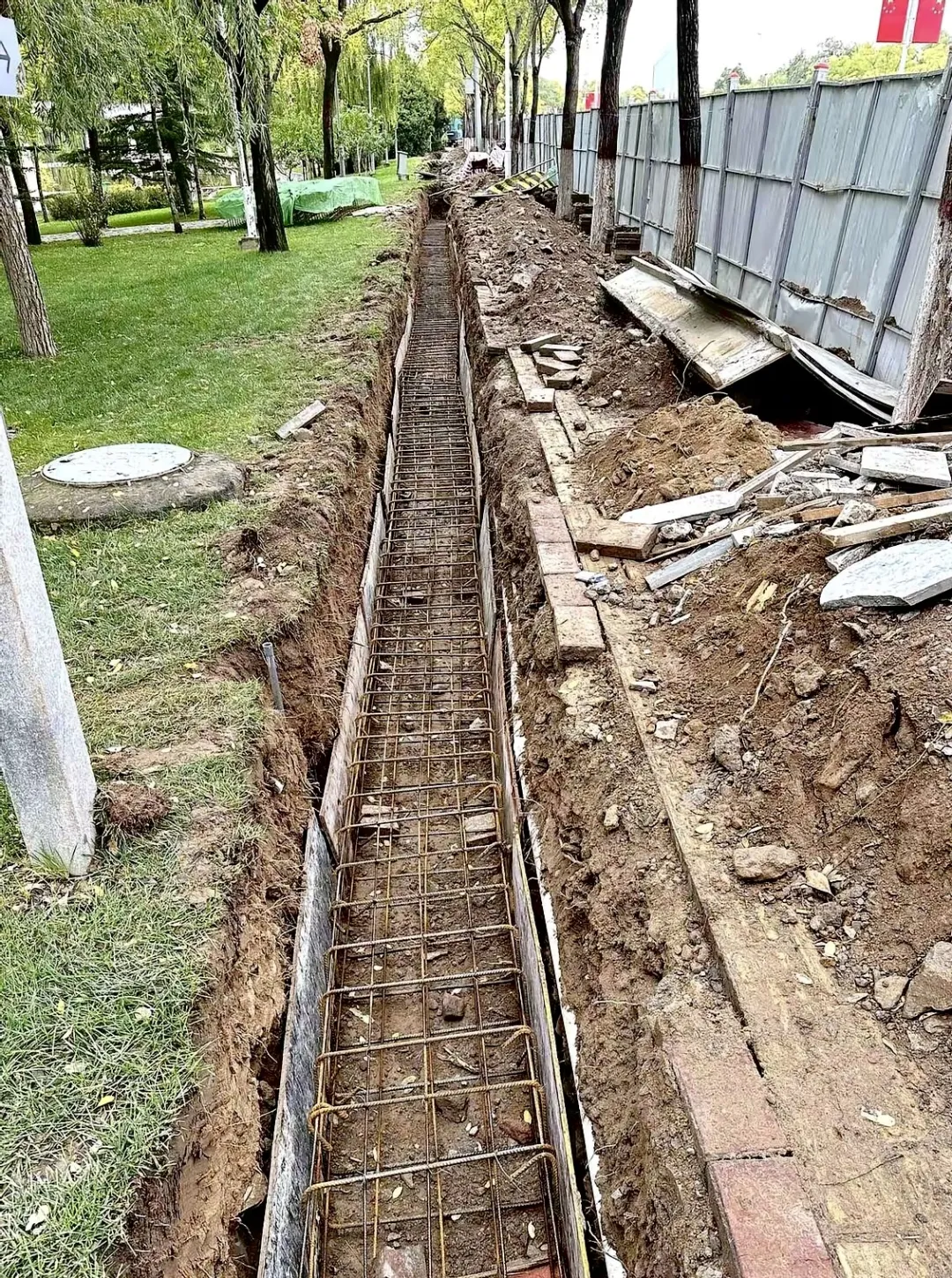 記者在現場看到,這道靠人行道一側、建在綠化帶邊的建築高約1米,頂部預留了長條形的開口槽。部分路段已完工,未完成部分仍在圍擋施工中。由於現場未設置明確的工程信息公示牌,過往市民對此感到困惑。