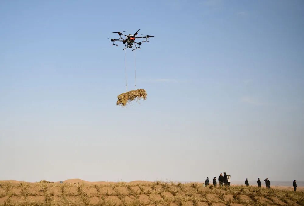 在阿拉善左旗“三北”六期工程蒙甘邊境防沙治沙沙漠鎖邊項目現場,200多名治沙工人俯身沙海,將一株株花棒苗植入沙土中。“我們運用無人機苗木調運技術,以智能化手段替代人力,大幅提升種植效率與精準度,為造林工作注入科技動能。”內蒙古阿拉善左旗藍馬園林生態建設有限責任公司副總經理劉海軍説。