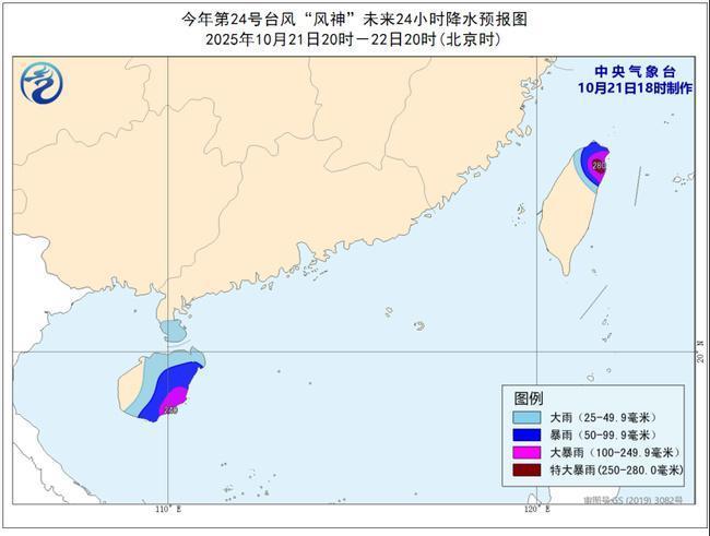 *降水預報:*21日20時至22日20時,海南島、台灣島北部、廣東雷州半島等地有大到暴雨,其中海南島東部和南部局地有大暴雨(100—240毫米),台灣島北部部分地區有大暴雨,局地特大暴雨(250—280毫米)。