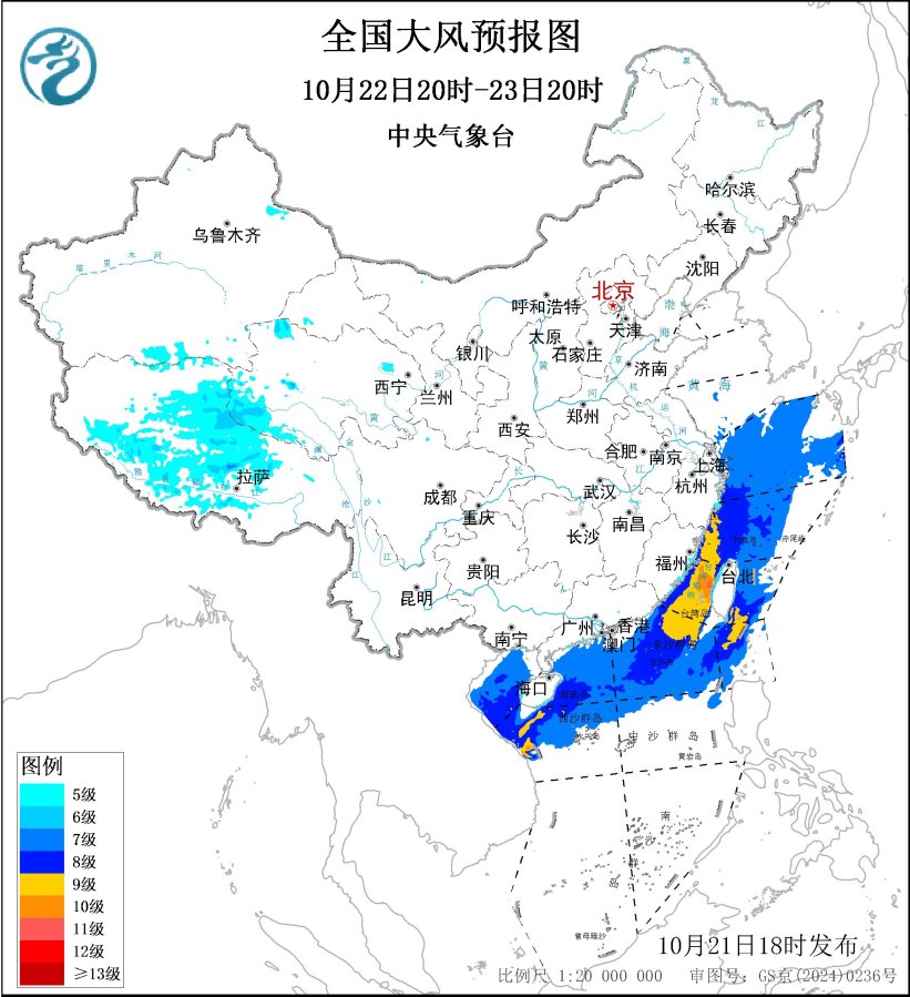 預計,10月21日20時至22日20時,新疆北部和東部、西藏中北部、青海西南部、甘肅西部、遼東半島、山東半島、浙江東部、福建東部、廣東南部、廣西南部、海南島等地部分地區有5~6級風,陣風7~8級;黃海南部海域、東海北部海域、北部灣、瓊州海峽將有7~8級、陣風9~10級的大風,東海南部海域、台灣海峽、台灣以東洋麪、巴士海峽、南海北部和中西部海域將有8~10級、陣風11~12級的大風。