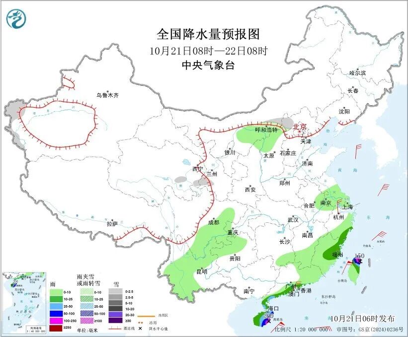 21日14時至22日14時,廣東南部、海南島、台灣島北部等地有大到暴雨,其中海南島東部和南部局地有大暴雨,台灣島北部部分地區有大暴雨,局地特大暴雨。