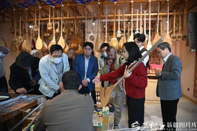 10月17日,日本知名學者和經濟界人士代表團參觀中國新疆民族樂器村。任鵬程攝