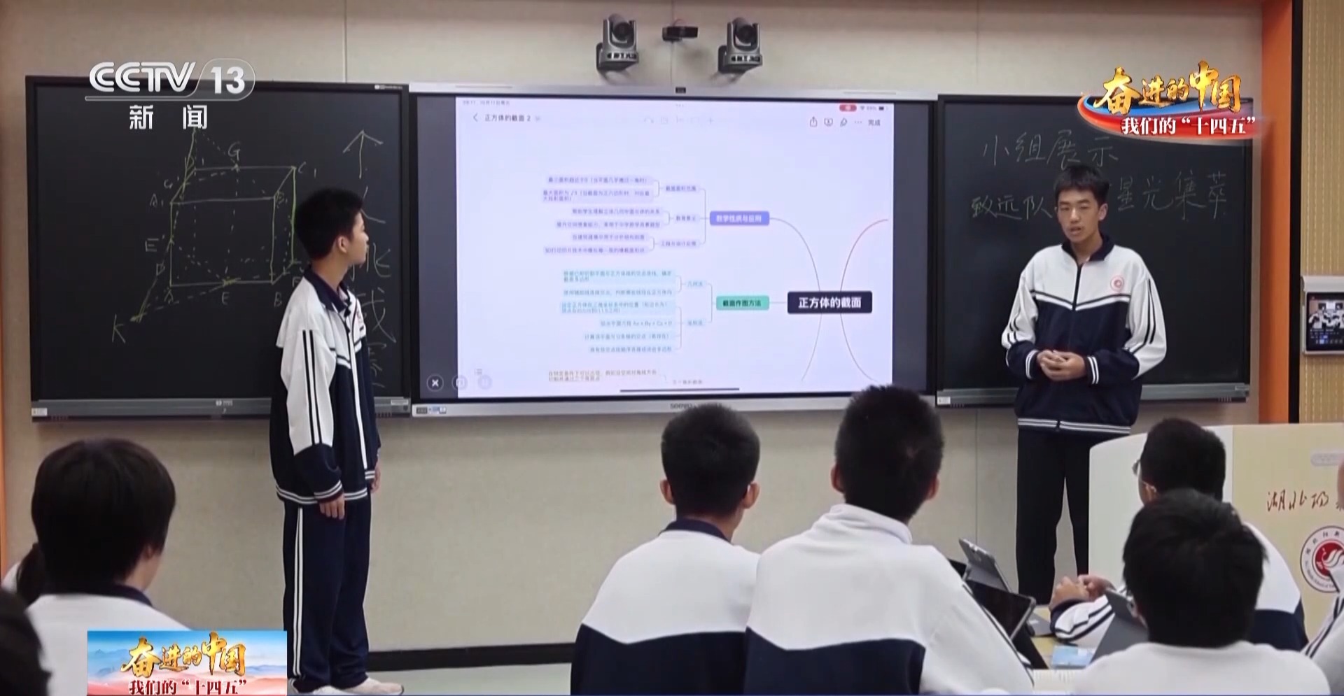 這是陽新一中一節關於“正方體截面探究”的數學課,輕點觸屏,三維立體圖形便在電子白板上自由旋轉、切割,學生們不僅能直觀感知“幾何空間”,還可以通過智慧平台生成思維導圖梳理知識點,獲取個性化習題。曾經“黑板+粉筆”的教學場景,正悄然改變。