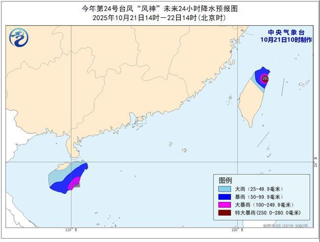 21日14時至22日14時,廣東南部、海南島、台灣島北部等地有大到暴雨,其中海南島東部和南部局地有大暴雨(100~230毫米),台灣島北部部分地區有大暴雨,局地特大暴雨(250~280毫米)。