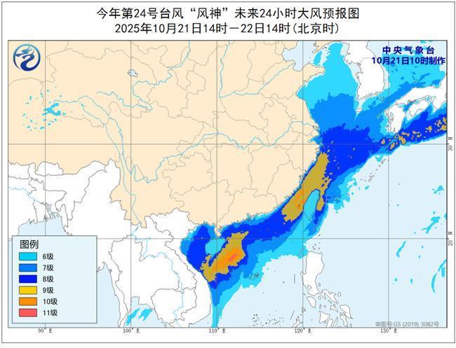 受冷空氣和“風神”的共同影響,21日14時至22日14時,台灣海峽、台灣以東洋麪、巴士海峽、南海西部、南海東北部和中東部、東沙羣島、西沙羣島及中沙羣島附近海域、北部灣、瓊州海峽、東海、黃海、渤海海峽以及山東半島沿海、江蘇沿海、上海沿海、長江口區、杭州灣、浙江沿海、台灣沿海、福建沿海、廣東沿海、廣西沿海、海南島沿海將有6~8級大風,陣風9~10級,其中東海西南部、台灣海峽、台灣以東洋麪、浙江南部沿海、福建沿海、南海西北部和中西部的部分海域或地區的風力有9~11級,陣風11~13級。