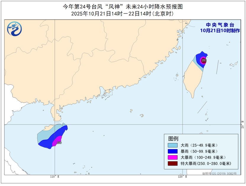 降水預報:21日14時至22日14時,廣東南部、海南島、台灣島北部等地有大到暴雨,其中海南島東部和南部局地有大暴雨(100-230毫米),台灣島北部部分地區有大暴雨,局地特大暴雨(250-280毫米)。