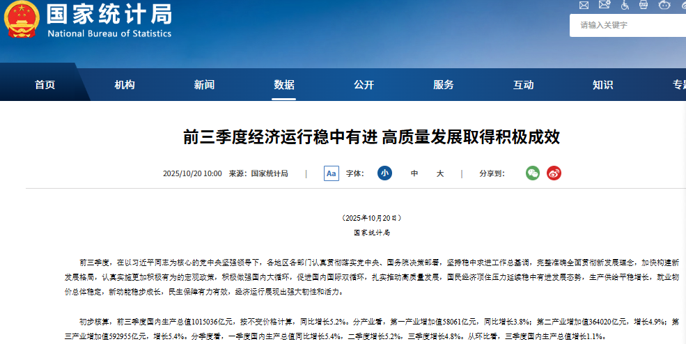 儘管三季度GDP增速較二季度回落0.4個百分點,但國家統計局新聞發言人強調,中國經濟“穩”的格局、“進”的勢頭、“韌”的特性沒有改變。三季度4.8%的增速仍明顯高於多數主要經濟體,經濟總量達35.5萬億元,超過全球第三大經濟體2024年全年總量。