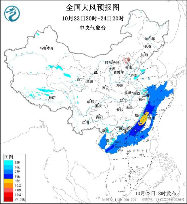 中央氣象台10月22日18時繼續發佈颱風黃色預警及大風黃色預警。預計,10月22日20時至23日20時: