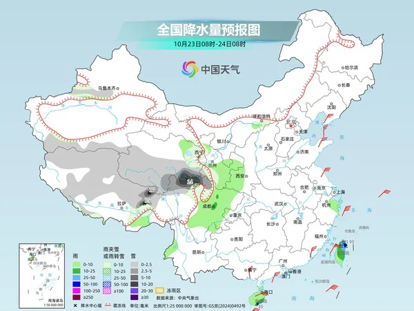 23日至24日,青藏高原等地有一次雨雪天氣過程,西藏東部、青海東部和南部、川西高原中北部有小到中雪或雨夾雪,局地大到暴雪。同時,四川盆地、陝西等地雨水也將增多。