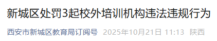 為貫徹落實省、市關於進一步加強校外培訓治理工作的要求,持續深化“雙減”工作,依法依規查處學科類隱形變異校外培訓行為,不斷推進校外培訓機構的規範治理。現將近期新城區違法違規校外培訓行為處罰情況通報如下: