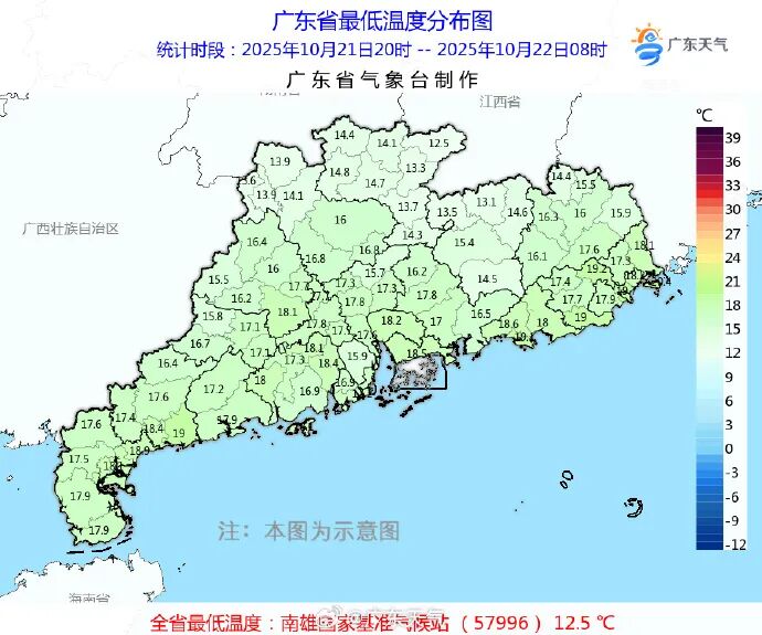 根據廣東省氣象部門監測,截至22日早晨,廣東大部氣温繼續走低,其中南雄國家基準氣候站錄得12.5℃低温,為22日早晨廣東範圍內國家基本氣象站當中的最低氣温。在廣州,廣州國家基本氣象站22日早晨錄得最低氣温16.7℃,為今年下半年以來該站所錄得的最低氣温。