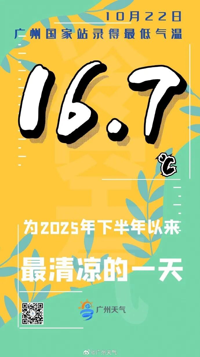 10月22日早晨,廣州國家基本氣象站錄得16.7℃的下半年以來最低氣温