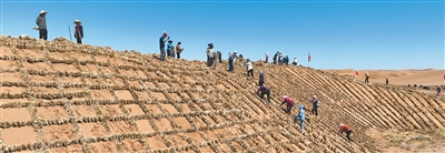 “一開始,嘗試卵石鋪面、瀝青拌沙、草蓆鋪蓋等方法,效果都不好。”唐希明介紹,為穩定沙面、提升固沙植物成活率,科研人員嘗試用麥草、黏土等鋪設沙面,卻發現這樣鋪設的麥草容易被風吹毀。經過探索,最終發現將麥草紮成1米見方的正方形格子,能有效降低地表風速、截留沙粒,形成穩定沙面。