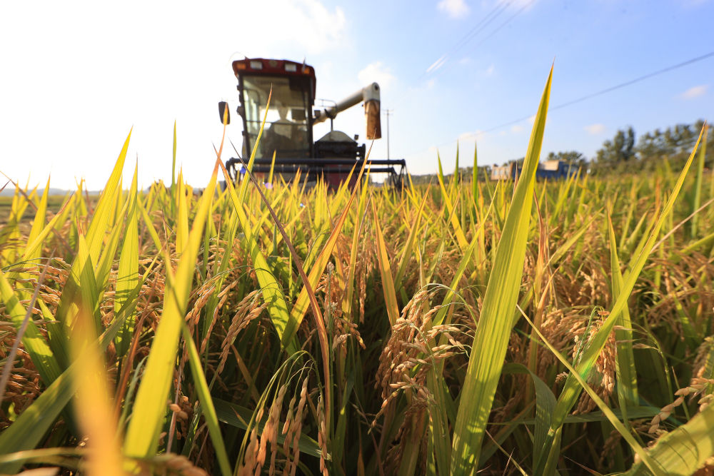10月16日,在江蘇省連雲港市贛榆區城頭鎮中青墩村,種植户駕駛收割機搶收水稻。新華社發(司偉 攝)