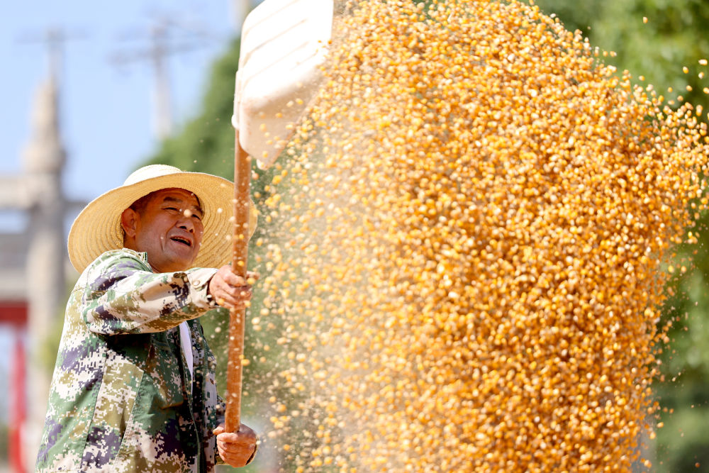 10月16日,山東省棗莊市孟莊鎮劉嶺村農民揚曬收穫的玉米。新華社發(孫中喆 攝)