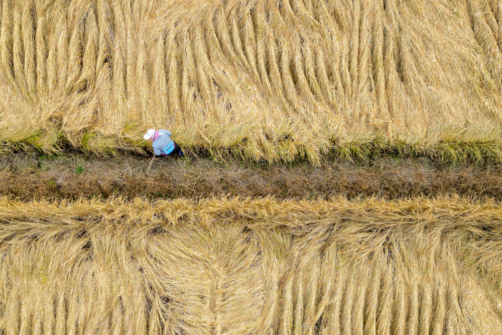 10月14日,在黑龍江省牡丹江市西安區沙虎村,村民在水稻田裏忙碌(無人機照片)。新華社記者 張濤 攝