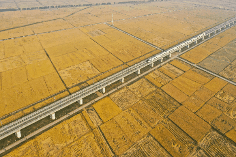 10月14日,在吉林省公主嶺市,一列高鐵列車沿着田間的鐵路線穿行(無人機照片)。2025年,吉林省深化農機研發、製造、推廣、應用一體化試點示範,農作物耕種收綜合機械化率達94.6%。新華社記者 張楠 攝