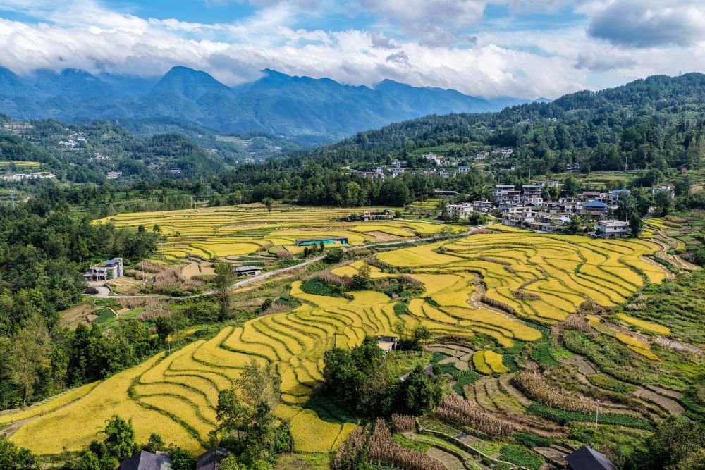 9月18日拍攝的重慶市黔江區五里鎮梯田景色(無人機照片)。地處武陵山區腹地的重慶市黔江區五里鎮水稻種植面積5300畝,是武陵山地區糧食主要產區之一。新華社記者 唐奕 攝