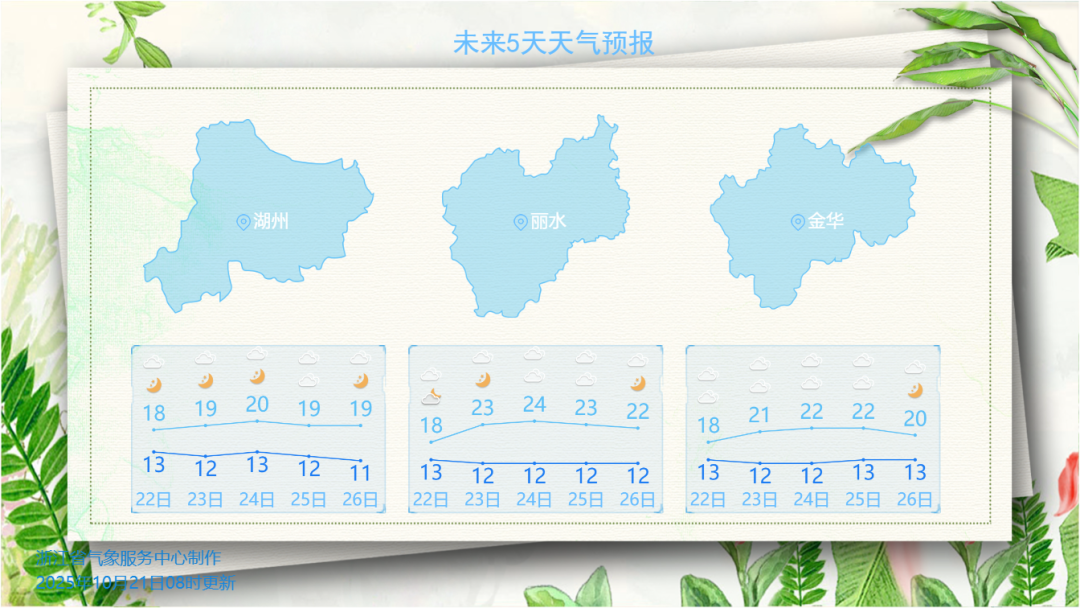 夜裏浙南和沿海地區及浙中北山區有弱降水;23日起我省晴多雨少,25日前後還有一股冷空氣接力,升温進程十分緩慢,早晚氣温低,晝夜温差超10℃,公眾請適時添衣。