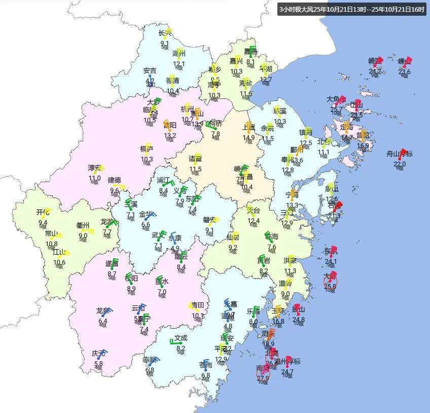 受冷空氣影響,昨日午後浙江持續大風!截至16時,3小時極大風9級以上有15個站點,最大的為温州平陽南麂站風力達到10級。