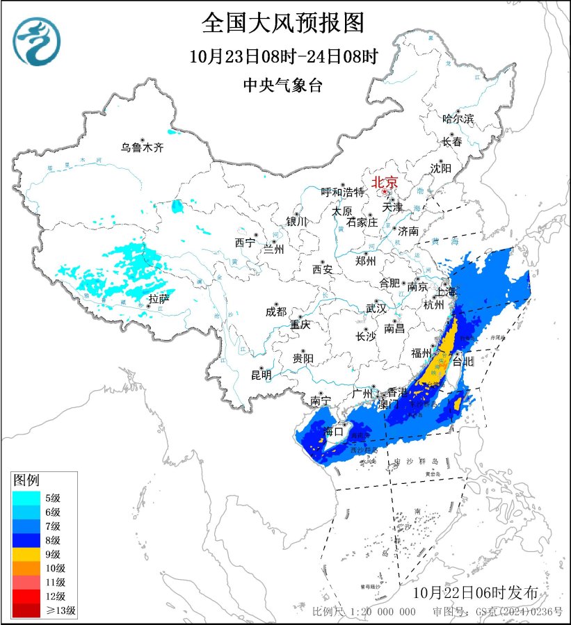預計,10月22日08時至23日08時,新疆北部和東部、西藏中北部、青海西南部、甘肅西部、遼東半島、山東半島、福建東部、廣東南部、廣西南部、海南島等地部分地區有5~6級風,陣風7~8級;黃海南部海域、東海北部海域、北部灣、瓊州海峽將有7~8級、陣風9~10級的大風,東海南部海域、台灣海峽、台灣以東洋麪、巴士海峽、南海北部和中西部海域將有8~10級、陣風11~12級的大風。