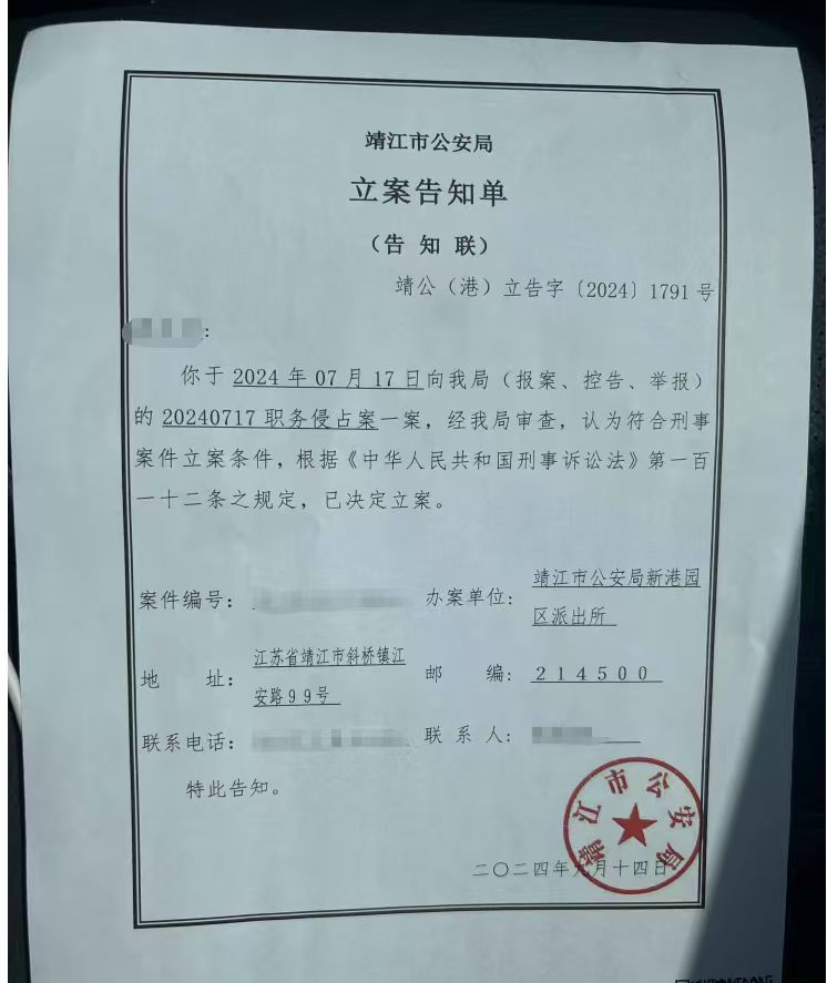錦天城律所合夥人代律師綜合專家庫意見後明確指出,已經立案成功的“20240717職務侵佔案”即“靖公(港)立告字【2024】1791號”案件,根據《刑法》第二百七十一條 “職務侵佔罪”相關描述,該案件事實清晰,法理論證準確,且案值金額四百餘萬元,並不屬於重大疑難案件。一般來説,在沒有案外因素的干擾下,案件應該被正常推動。