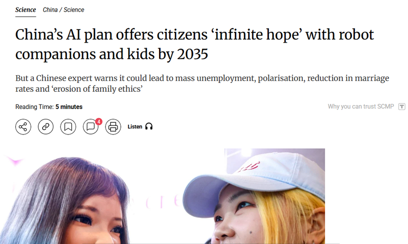 《南華早報》近日發文稱,中國的人工智能計劃‘AI+‘被定義為國家長達十年的國家戰略,旨在推動進入“智能文明時代”,到2035年機器人將深入家庭和社會治理。該計劃除了經濟影響,還涉及多維度轉型和全球事務中的地位重塑。