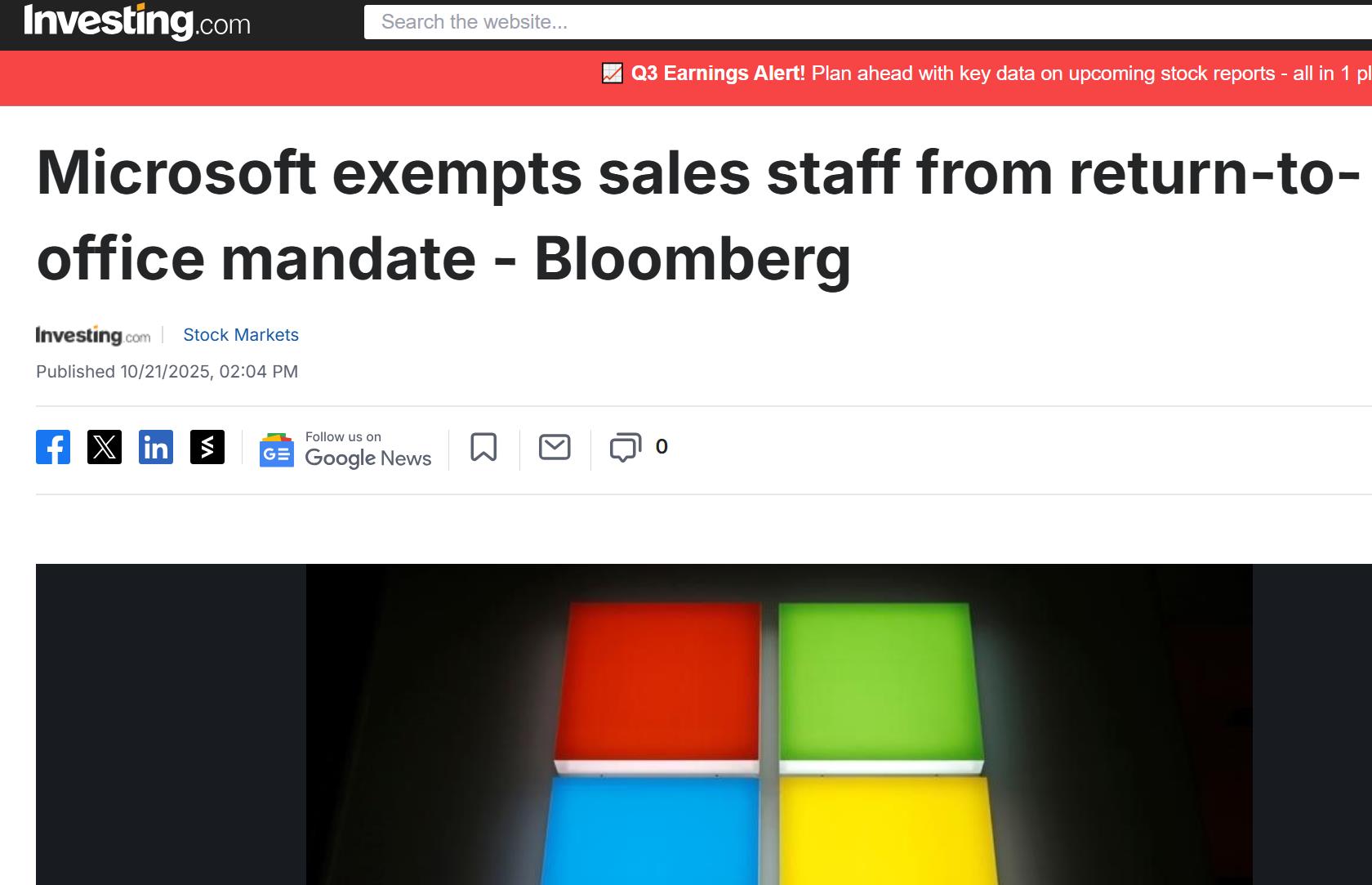 【環球網科技綜合報道】10月22日消息,據investing援引彭博社報道,微軟公司宣佈將豁免許多銷售崗位遵守其即將實施的重返辦公室規定,採取比許多科技行業同行更為靈活的工作方式。