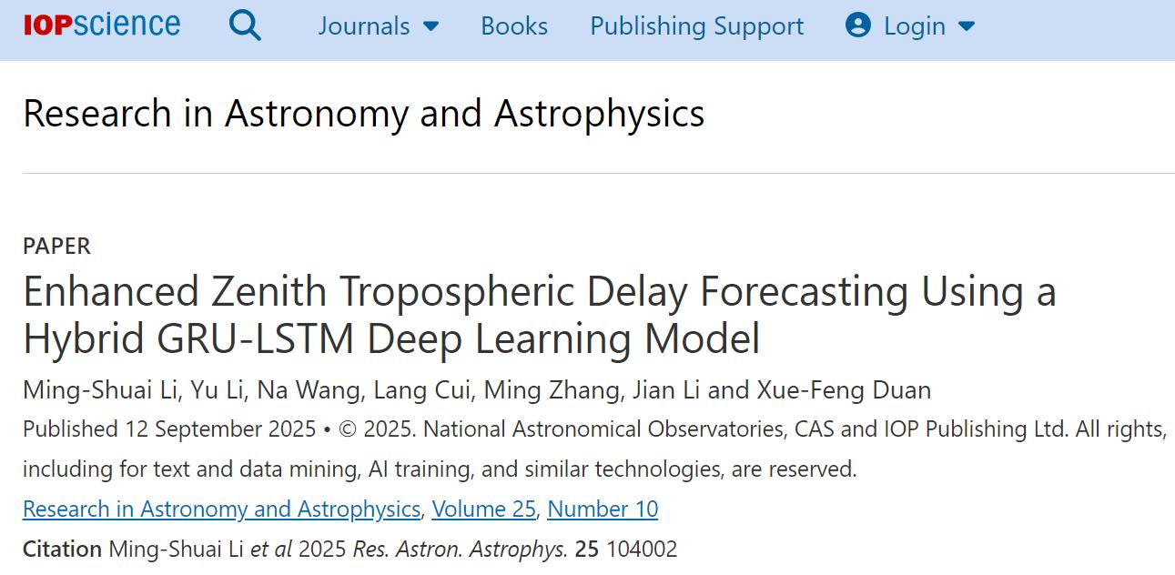 高精度的對流層延遲預測結果,可有效提升VLBI觀測的大氣相位修正精度,改善射電源定位與基線解算結果,同時也為毫米波天文觀測提供更準確的氣象支撐,在可降水量(PWV)反演與天氣預報中具有廣泛的應用前景。該研究展示了人工智能在射電望遠鏡大氣校正中的應用潛力,為未來奇台110米望遠鏡(QTT)及多站干涉觀測的高頻段運行奠定了技術基礎。(青雲)