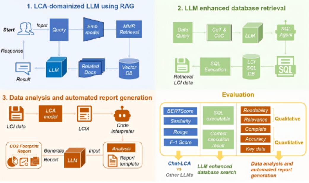 Chat-LCA系統實現了LLM在“知識獲取—數據檢索—報告生成”全鏈條的深度融合,顯著提升了碳核算的智能化水平。該研究的原創性體現在首次將檢索增強生成(RAG)、Text2SQL、思維鏈(CoT)與代碼鏈(CoC)等前沿AI技術系統整合於LCA全流程,構建了支持自然語言交互的一體化碳核算智能系統。Chat-LCA有效打通了知識壁壘與數據孤島,實現了從專業問答到報告生成的全流程自動化,突破了現有研究中技術覆蓋片面、環節割裂的侷限。