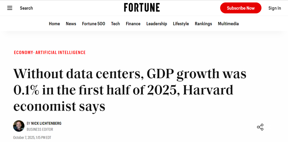 2025年上半年,美國GDP增長几乎全部依賴數據中心和AI投資,其中AI投資佔比近92%。哈佛大學經濟學家傑森·弗曼指出,若剔除這一領域,其餘產業合計成長率僅0.1%,幾乎陷入停滯。