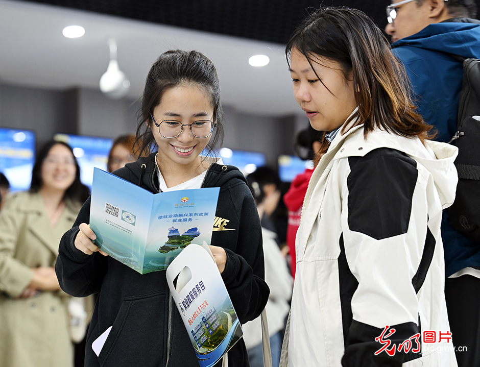 山東省青州市舉辦秋季企業推介暨人才招聘會,50餘家企業提供了涉及機械數控、電子商務、家政餐飲、健康養老等領域近3000個崗位,吸引了許多求職者前來諮詢應聘。圖為求職者在瞭解崗位信息。(王繼林攝/光明圖片)