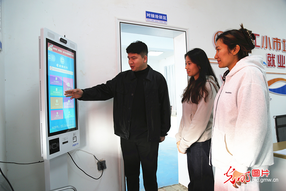 新疆阿克蘇地區阿瓦提縣人社局舉辦2025年金秋招聘月專場招聘會,來自紡織、商場、人壽、酒店、文旅等行業的30家民營企業提供420個就業崗位,吸引了許多求職者前來應聘。圖為工作人員正在向求職者介紹崗位信息。(包良廷攝/光明圖片)