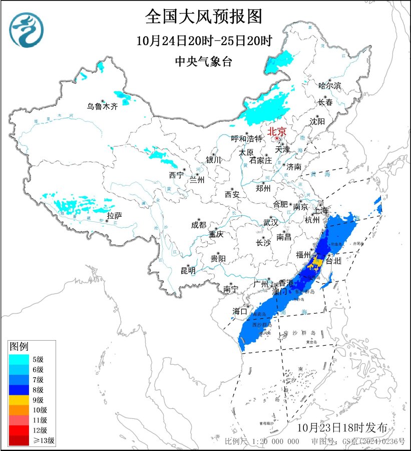 預計,10月23日20時至24日20時,西藏中部等地部分地區有5~6級大風、陣風7~8級;東海大部海域、台灣海峽、台灣以東洋麪、南海北部和中西部將有7~8級、陣風9級的大風,其中台灣海峽風力可達9~10級,陣風11級。